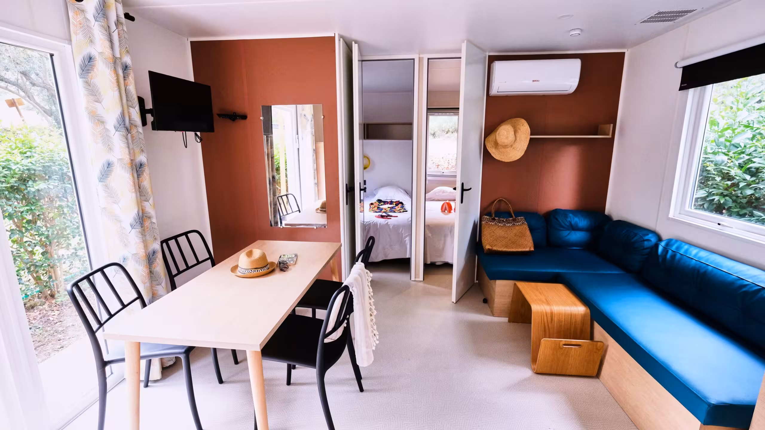 If you’d like to spend your vacations in comfortable accommodation, our mobile homes are like little vacation homes, combining comfort, simplicity and privacy with the natural feel of an open-air vacation. In all sizes, to suit all tastes and ages, they can be adapted to any type of holiday, allowing you to experience camping at your own pace, without worrying about the vagaries of the weather. Each model features a spacious living area, cozy bedrooms, a fully equipped kitchen, WIFI connection and air conditioning.. You can also relax in peace on your terrace or gather for an aperitif or a good meal together.